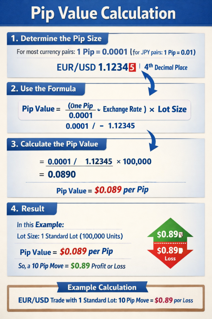Pip Value = (Pip Size × Lot Size) ÷ Exchange Rate